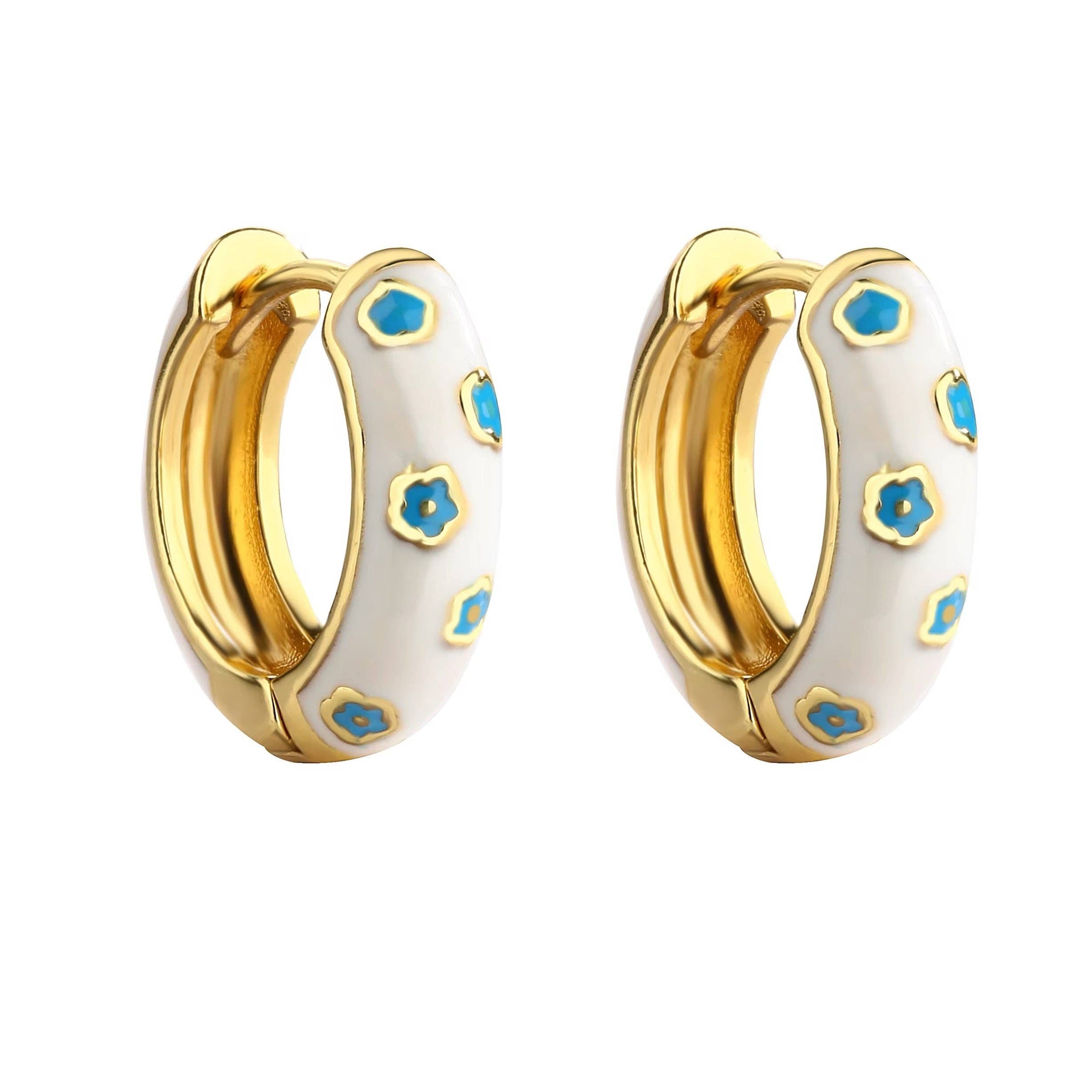 Dazzle and stack with our 1.5cm white enamel hoops, featuring a turquoise flower pattern. 🌸✨ Perfect for everyday wear and available in 6 stunning colour combos to suit any style!