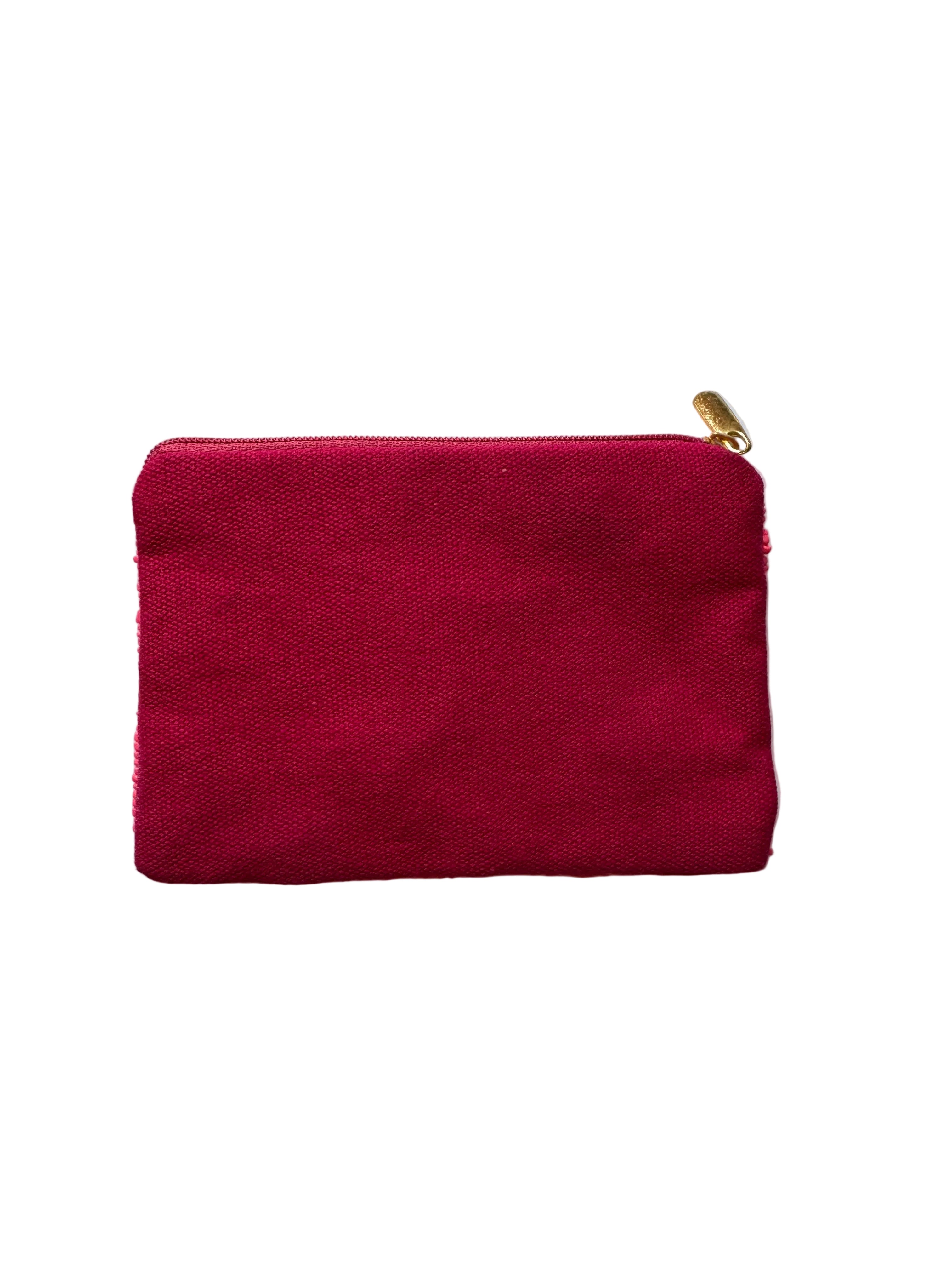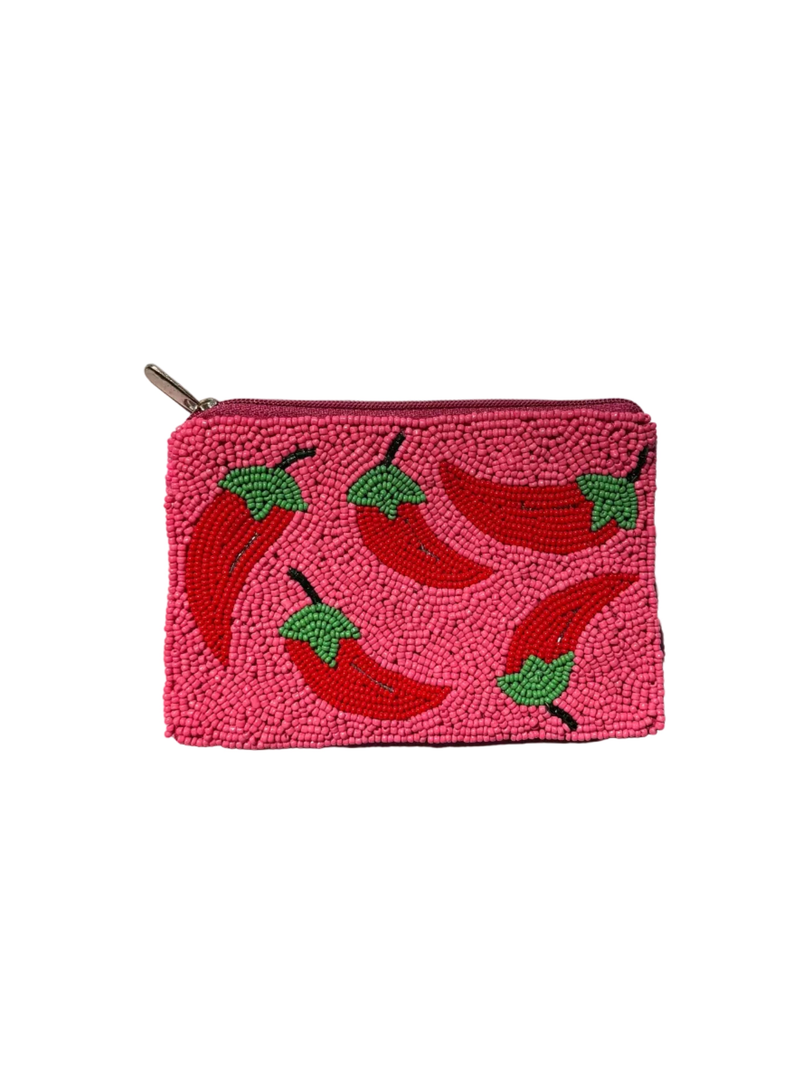 Add a pop of spicy style to your everyday carry with this cheeky beaded coin purse. Featuring a vibrant watermelon-hued beaded background adorned with bold red beaded chillis, it's the perfect blend of fun and function. The soft dark pink fabric backing keeps your coins secure while the playful design brings a smile to your face. Compact at 14x10cm, it's ideal for stashing loose change or small treasures. February delivery.