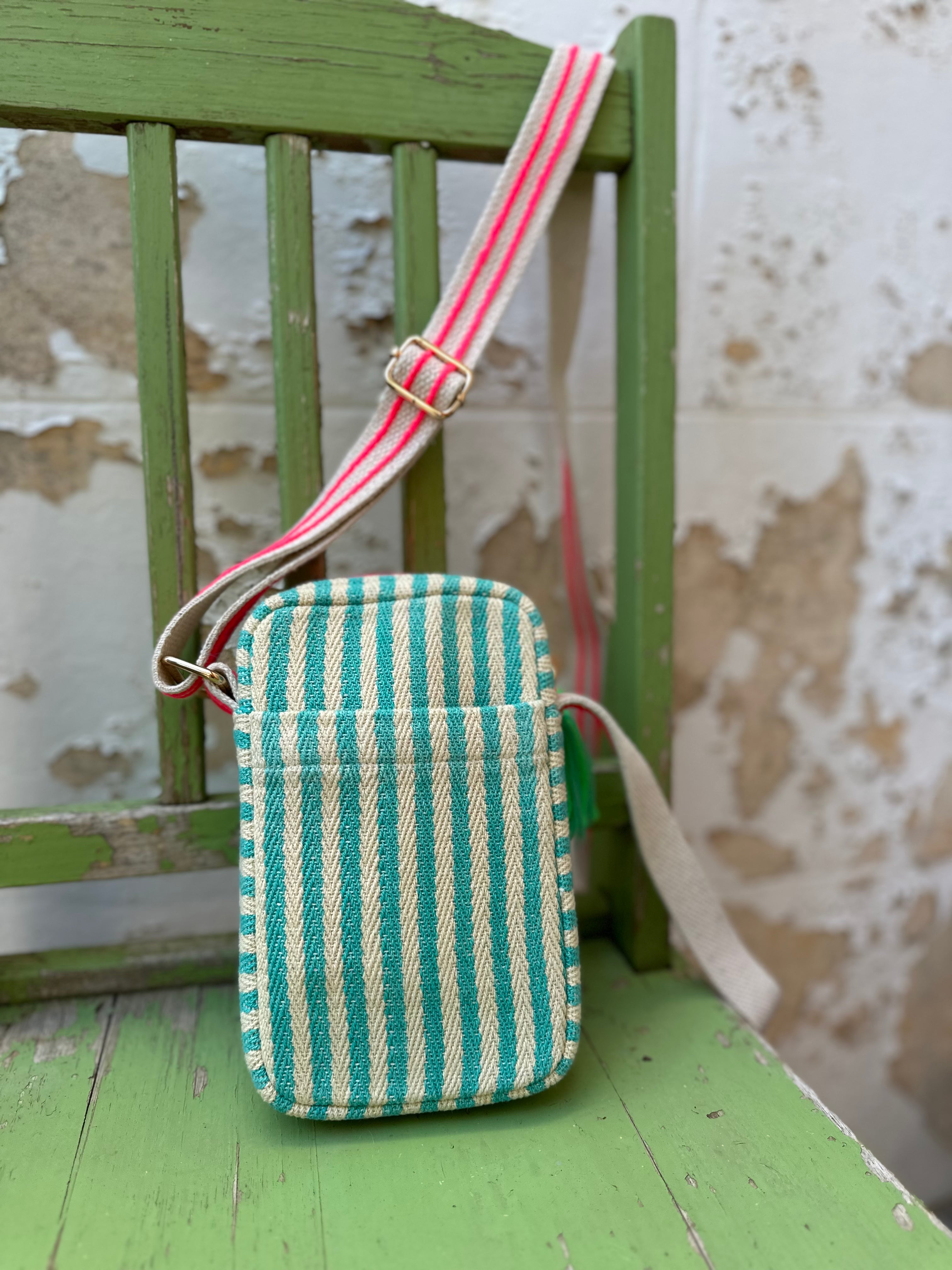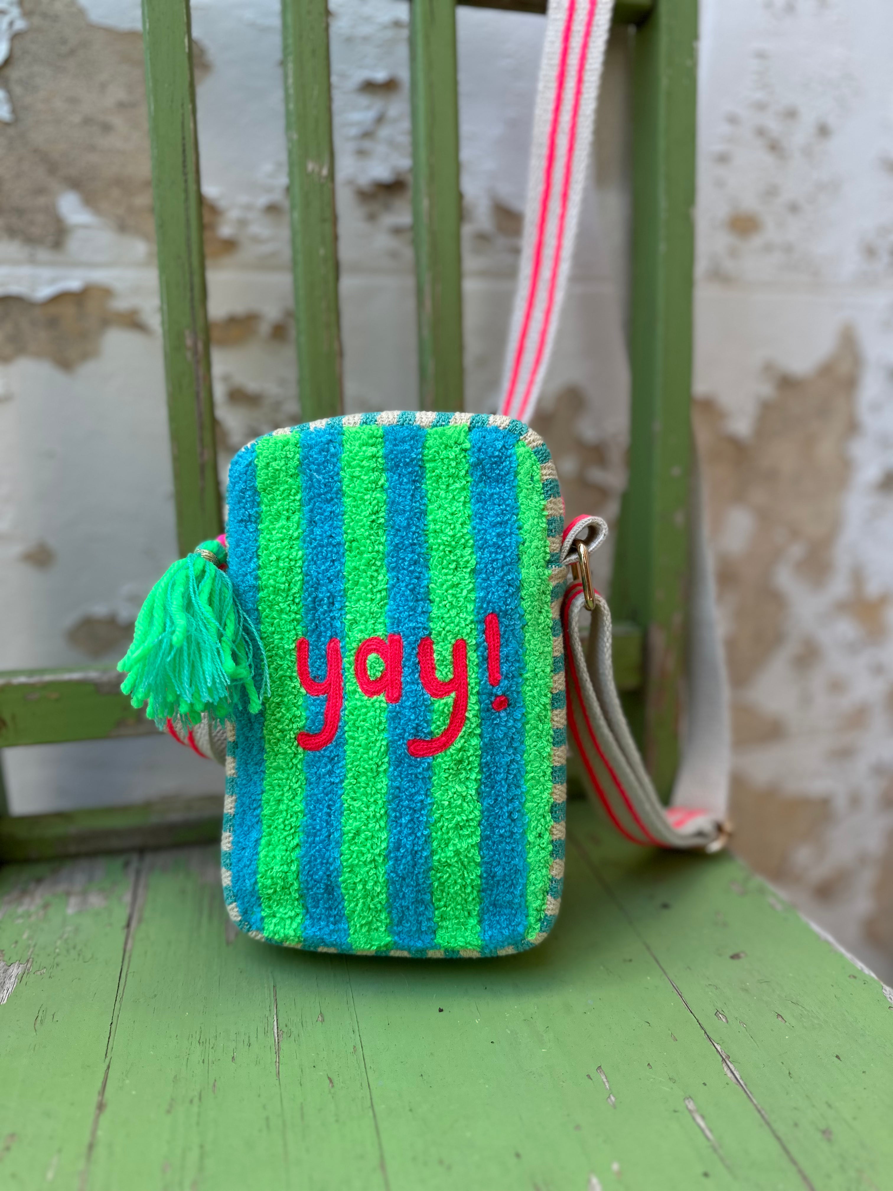 Carry your essentials with a pop of fun! Our Yay! mobile bag features an adjustable strap that adapts to your style, whether you're wearing it crossbody or over your shoulder. Featuring 'Yay!' embroidered in a fun pink over a bright blue and green stripe on the front, blue and white striped back and a vibrant yellow patterned lining with a pocket. Fun, functional, and ready for adventure!