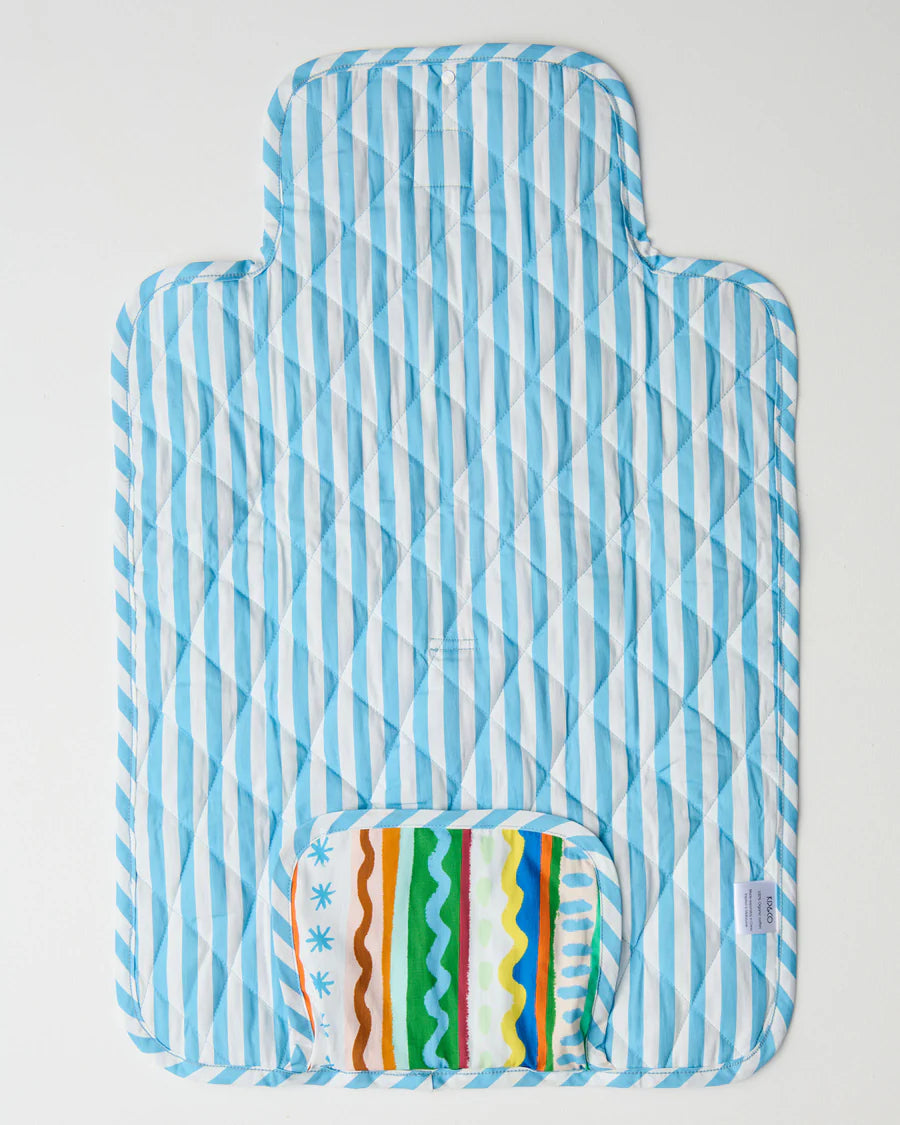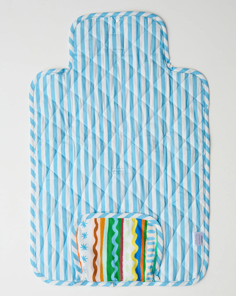 Our Beach Patterns Baby Change Mat is your on-the-go lifesaver, soft, quilted, and easy on the eyes. Made for quick changes wherever you roam, it folds up nice and neat to stash in your baby bag, pram, or car. Travel friendly and fuss-free! Made with organic cotton canvas, this mat has an outer featuring columns of lines, squiggles and star spotted patterns in a rainbow of colours, and a baby blue and white striped inner.