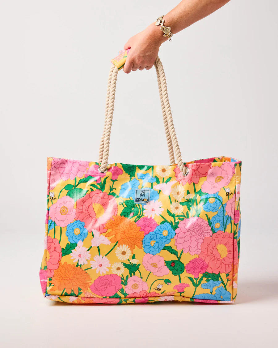 Big plans, busy days, or beach trips, our Follow The Sun Yellow Carry All has you sorted! Made from recycled plastic coated canvas, it’s roomy, sturdy, and splashed in signature Kip&Co print. Featuring hand-drawn florals in shades of pink, orange, and cornflower blue, dotted with friendly little bees and lady beetles on a sunny yellow base. Pack it, sling it, love it, this bag is built to carry it all (and look good doing it).