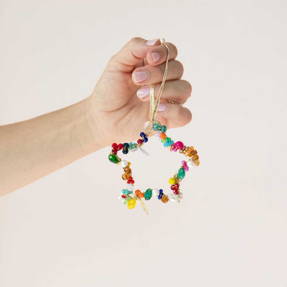 Add a vibrant touch to your holiday décor with this eye-catching Beaded Star Ornament. Carefully handcrafted with an array of colorful beads, charms, and sparkling accents, this ornament brings a playful and eclectic touch to any Christmas tree. Its bold colors and one-of-a-kind beads will make this piece stand out in your festive collection.