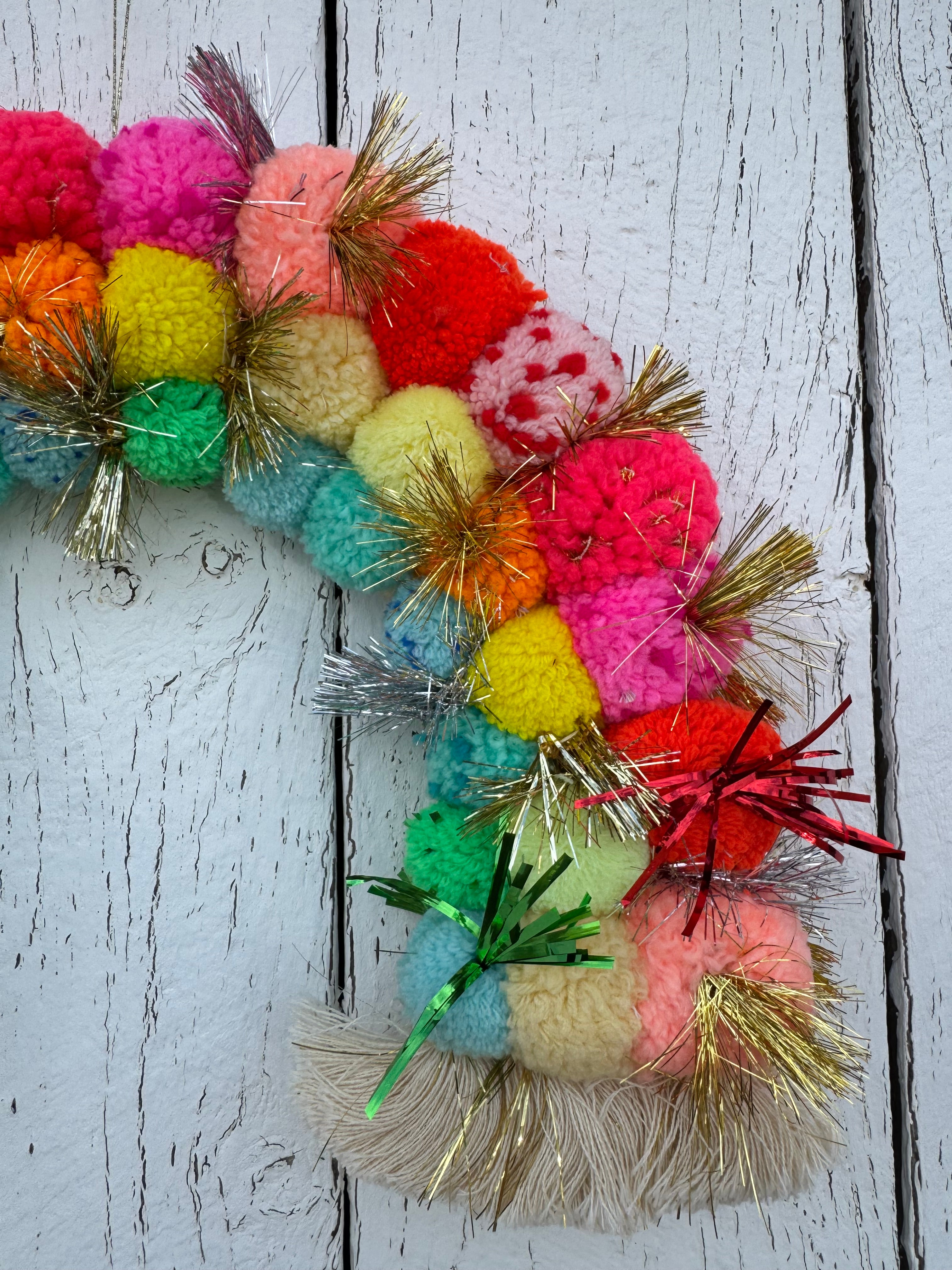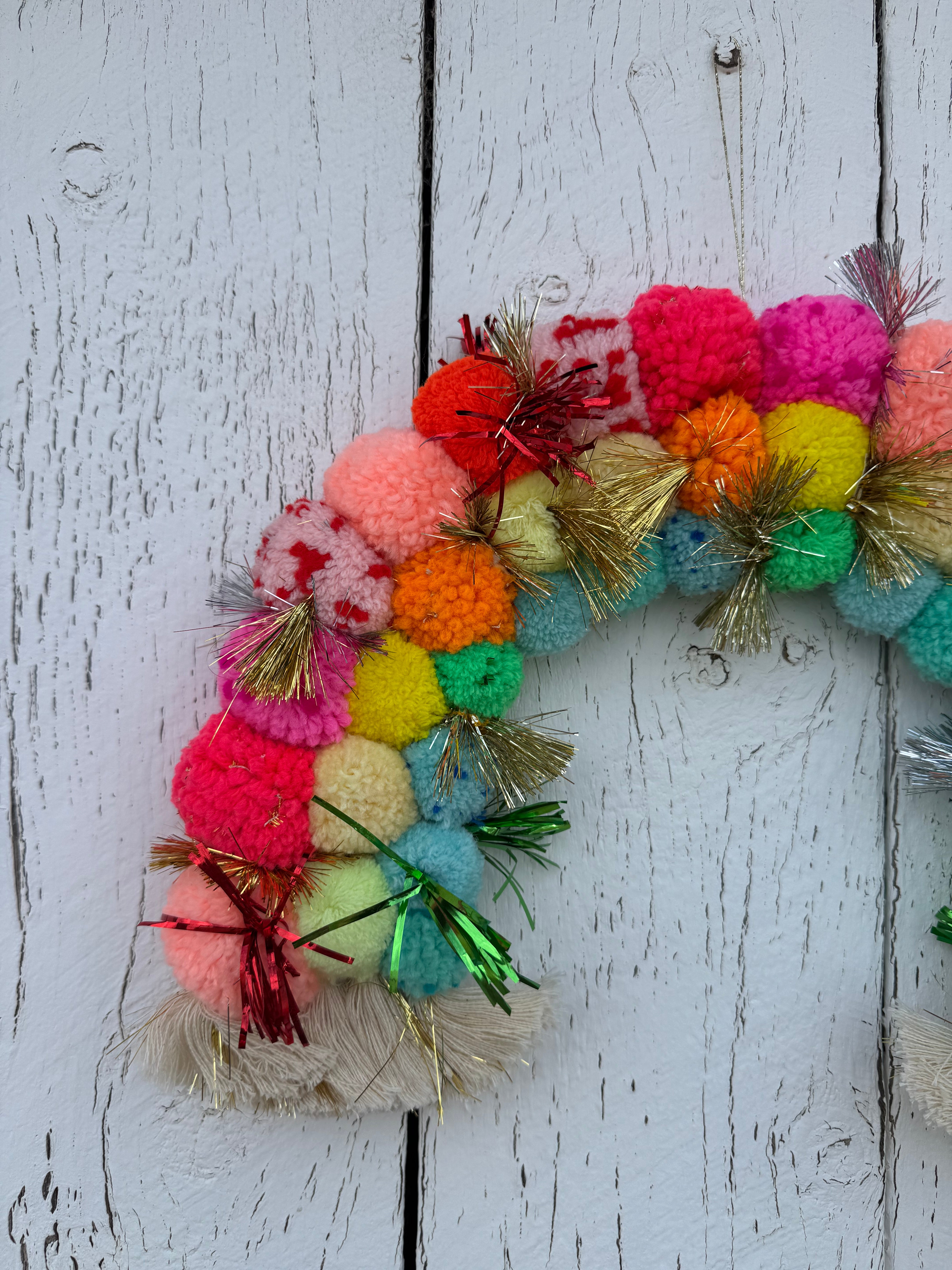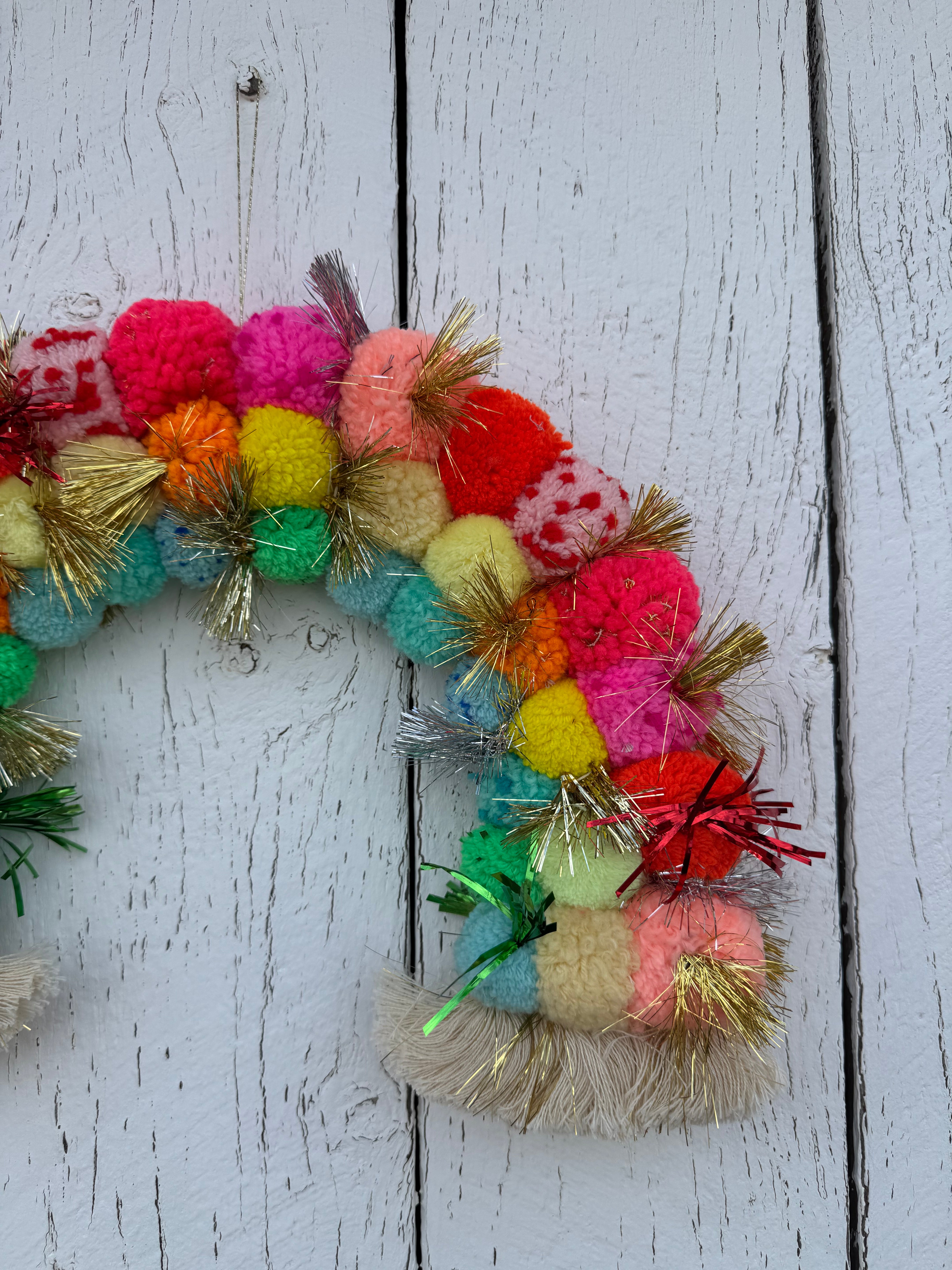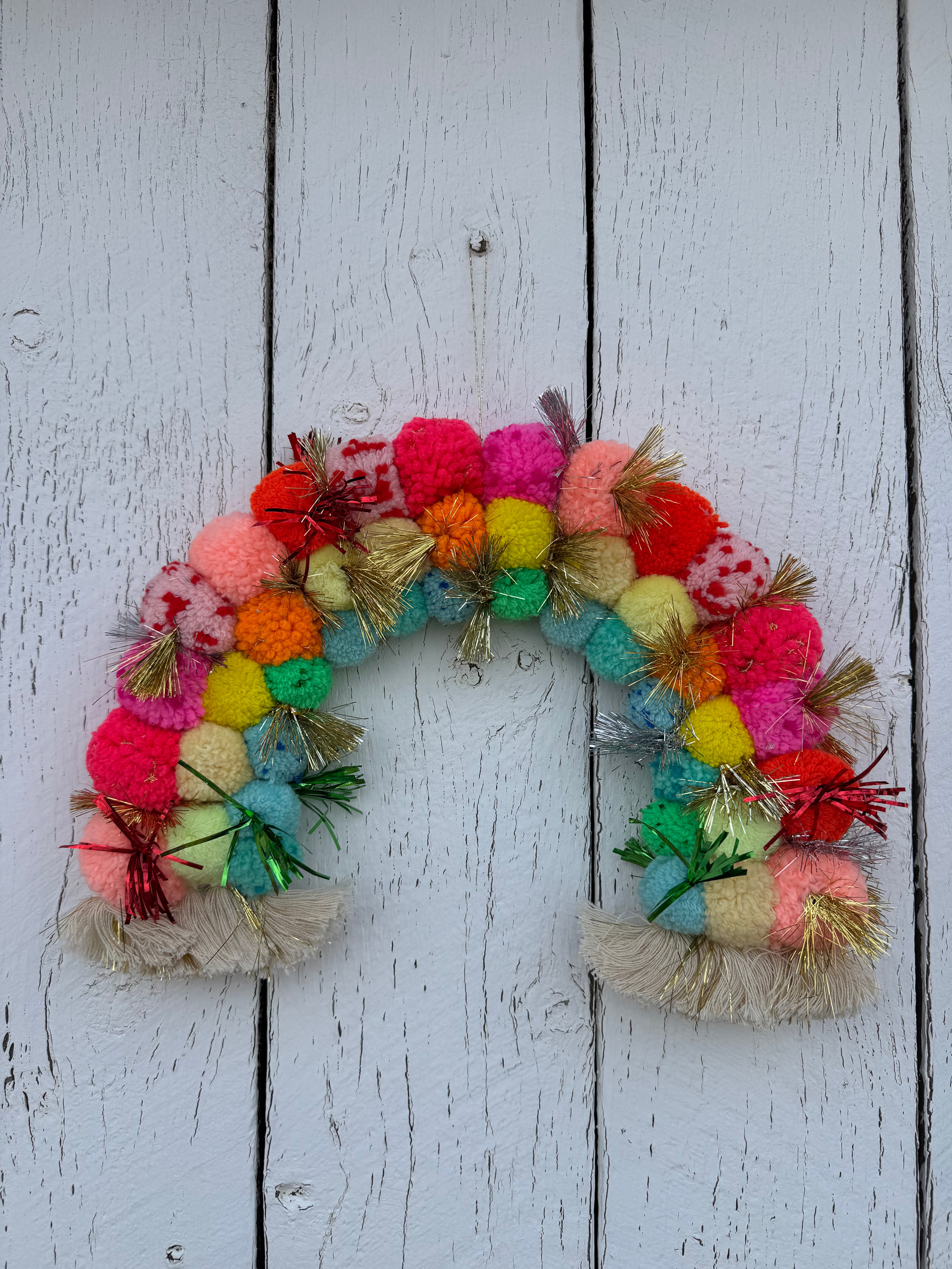 Brighten up any space with this playful Rainbow Pom Pom Hanging Decoration. Measuring approximately 30cm, it features vibrant multi-coloured pom poms accented with fun gold details. Ideal for kids’ rooms or lively parties, this cheerful decoration adds a joyful burst of colour and sparkle wherever it’s displayed.