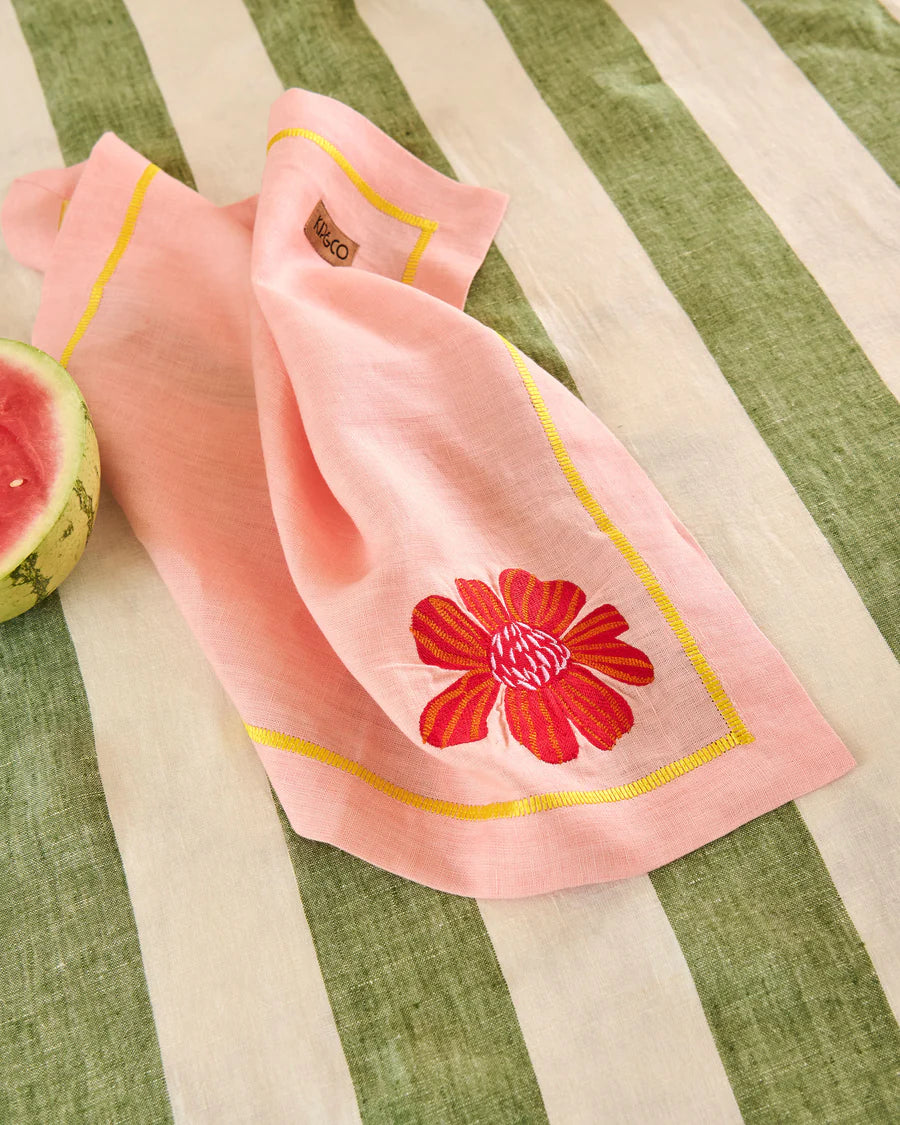 The Wild Flower Embroidered 4P Napkin Set will bring a little garden magic to every meal! Made from a soft pink linen-cotton blend, each napkin features a sunny yellow stitched border and a unique embroidered flower, making every place setting feel special. Perfect for beautiful brunches, alfresco lunches, or intimate dinner parties, these beauties pair effortlessly with our range of stunning table linens, cutlery, and glassware to turn any mealtime into a moment to remember.