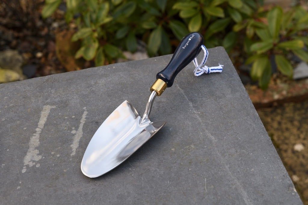 This hand trowel is the perfect partner to our Collector Hand Fork. It has a painted wooden handle in a sophisticated navy blue. The ferrule which connects head and handle is solid brass, bringing a beautiful warm highlight to the look. There’s a striped cotton hanging cord for easy storage. The polished stainless steel finish is highly resistant to rust, so it'll stay beautiful for years to come.