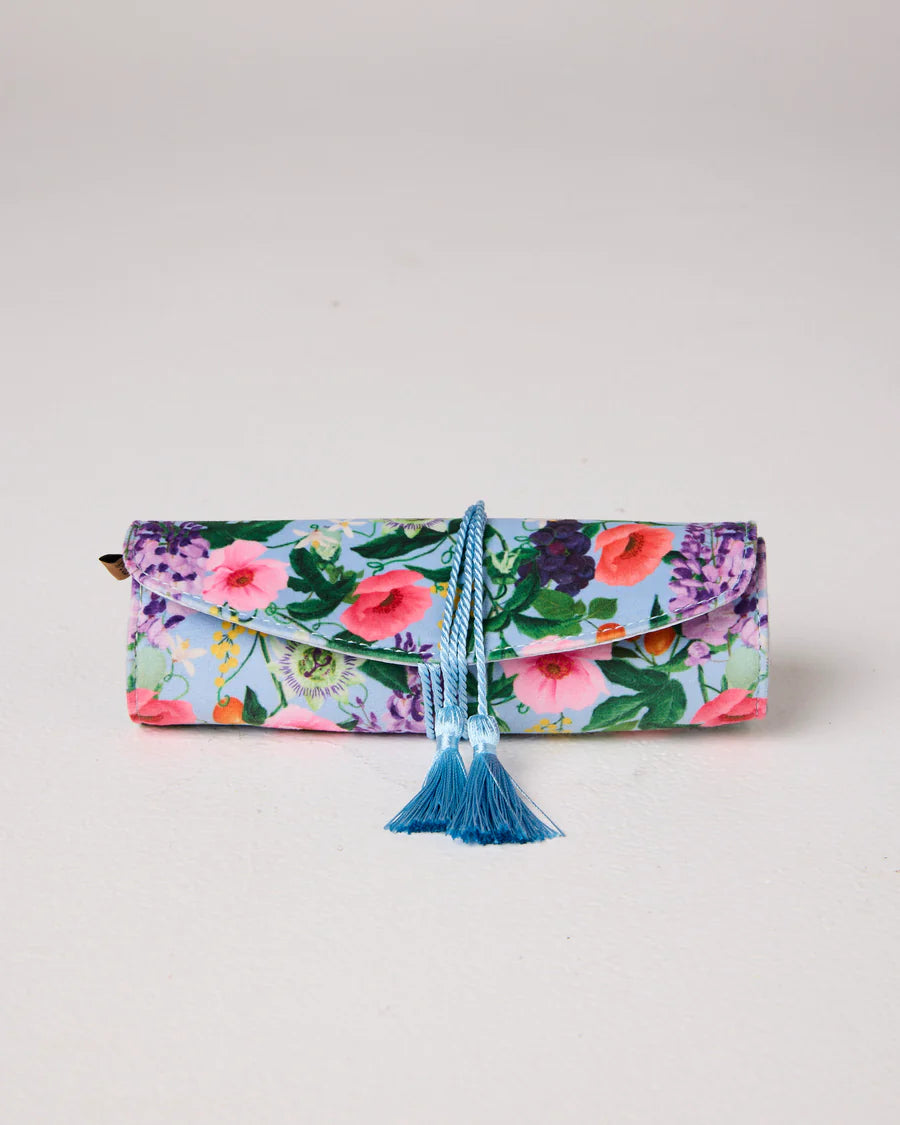 Tiny, tidy, and totally delightful! The Spring In The Air Velvet Jewellery Roll is your on-the-go treasure keeper, perfect for keeping rings, earrings, and little favourites organised with style. Three zipped compartments and a soft strap with a press-stud keep everything snug and secure, whether it’s darting from brunch to beach or tucked away in a drawer. Draped in soft blue velvet and sprinkled with cheerful springtime florals and fresh fruits, this roll is a little pocket of sunny charm wherever your day takes you.