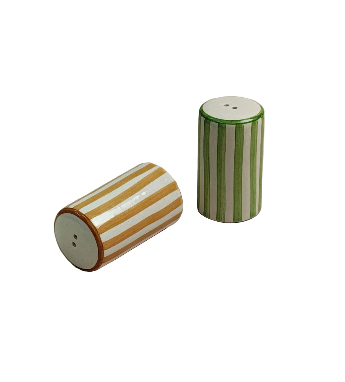 Inspired by classic European cafés, the Bistro Stripe Salt & Pepper Shakers feature hand-painted green and mocha stripes for a timeless yet playful look.