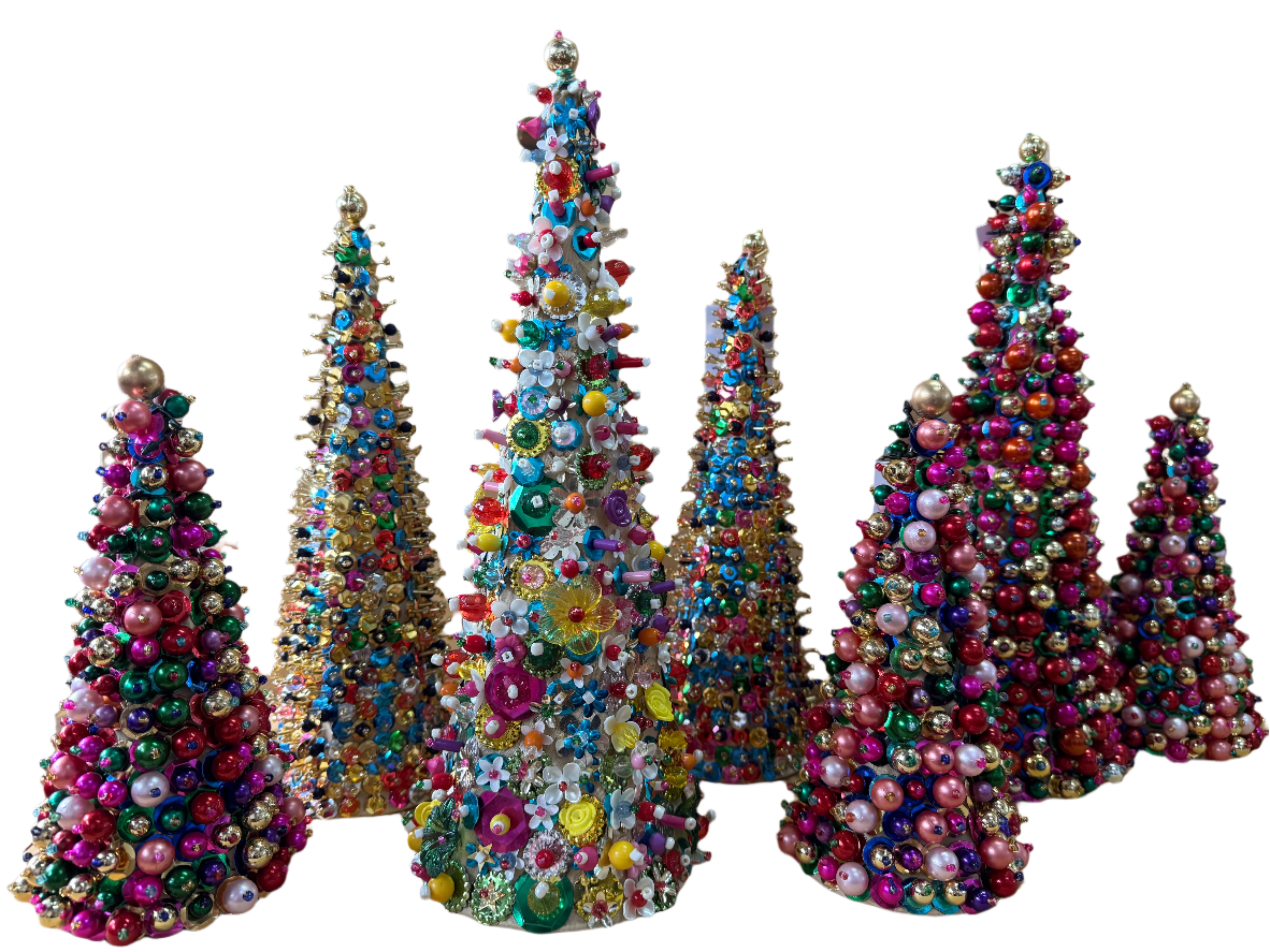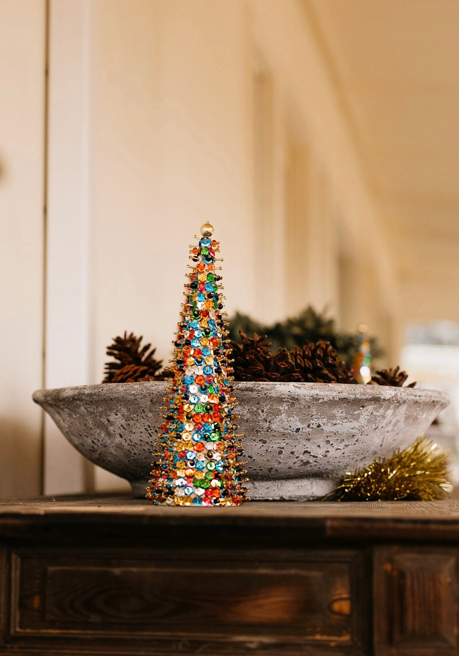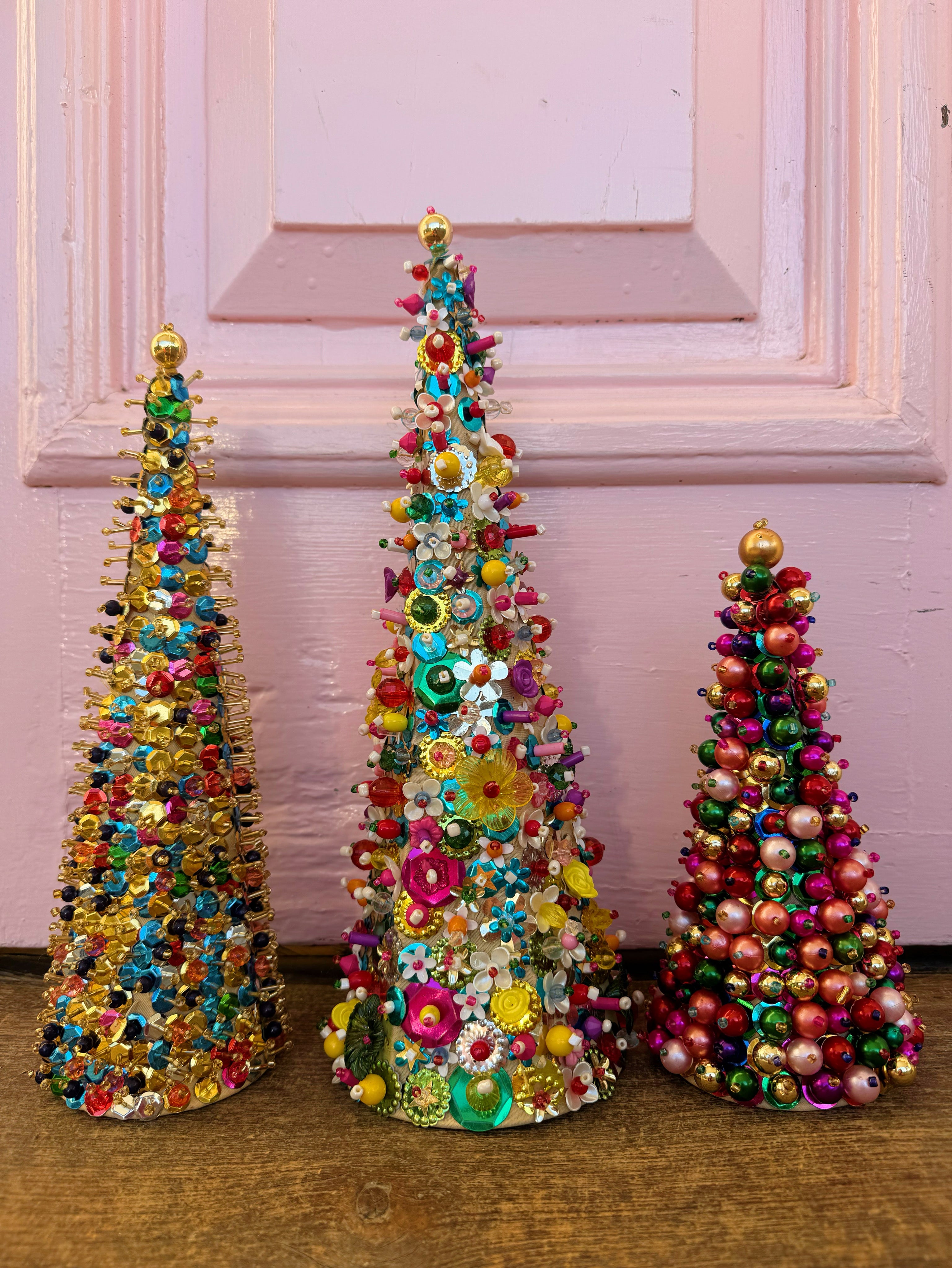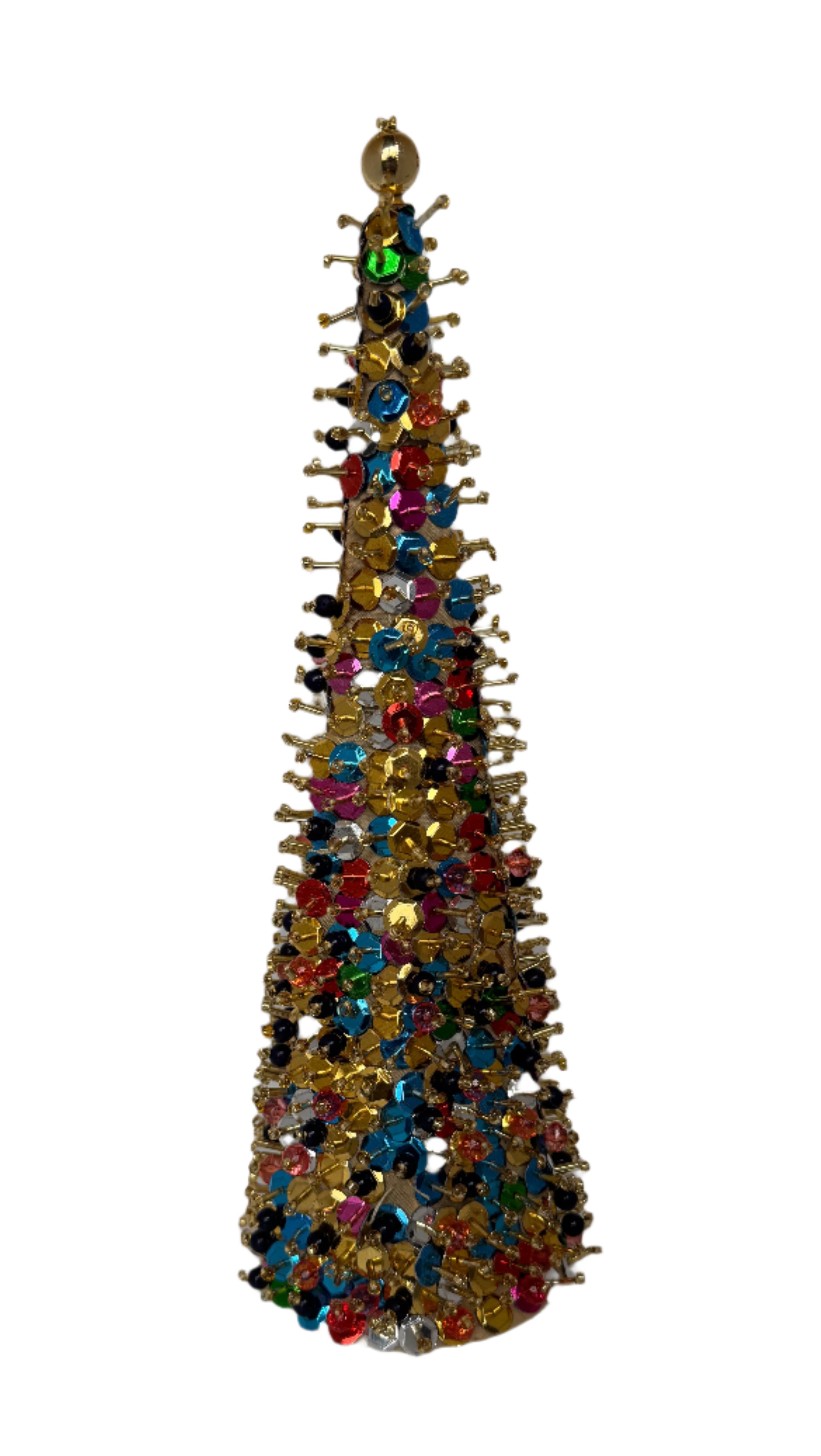 Bring a touch of nostalgic charm to your holiday decor with Sequin Beaded Festive Tree. Crafted from a hollow cone and adorned with a delightful mix of vintage-style beads and sequins, these trees sparkle beautifully in the sunlight. Available in a medium sized 9inch to add a playful, handcrafted sparkle to your festive celebrations. Other designs are also available to mix and match for a truly unique holiday display.