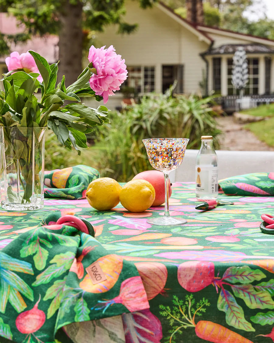 Serve up some serious garden charm with our Veggie Soup 4P Napkin Set. Featuring a medley of hand-drawn root veg, with carrots, beets, and radishes on a rich green base, these napkins are a feast for the eyes and your table. Made from our new linen-cotton blend, they’re soft, sturdy, and totally scrumptious. Whether you're plating up a cosy roast or a picnic spread, these napkins bring a wholesome helping of fun to every meal. Pair with the matching Veggie Soup Tablecloth for a full veggie-fuelled feast.