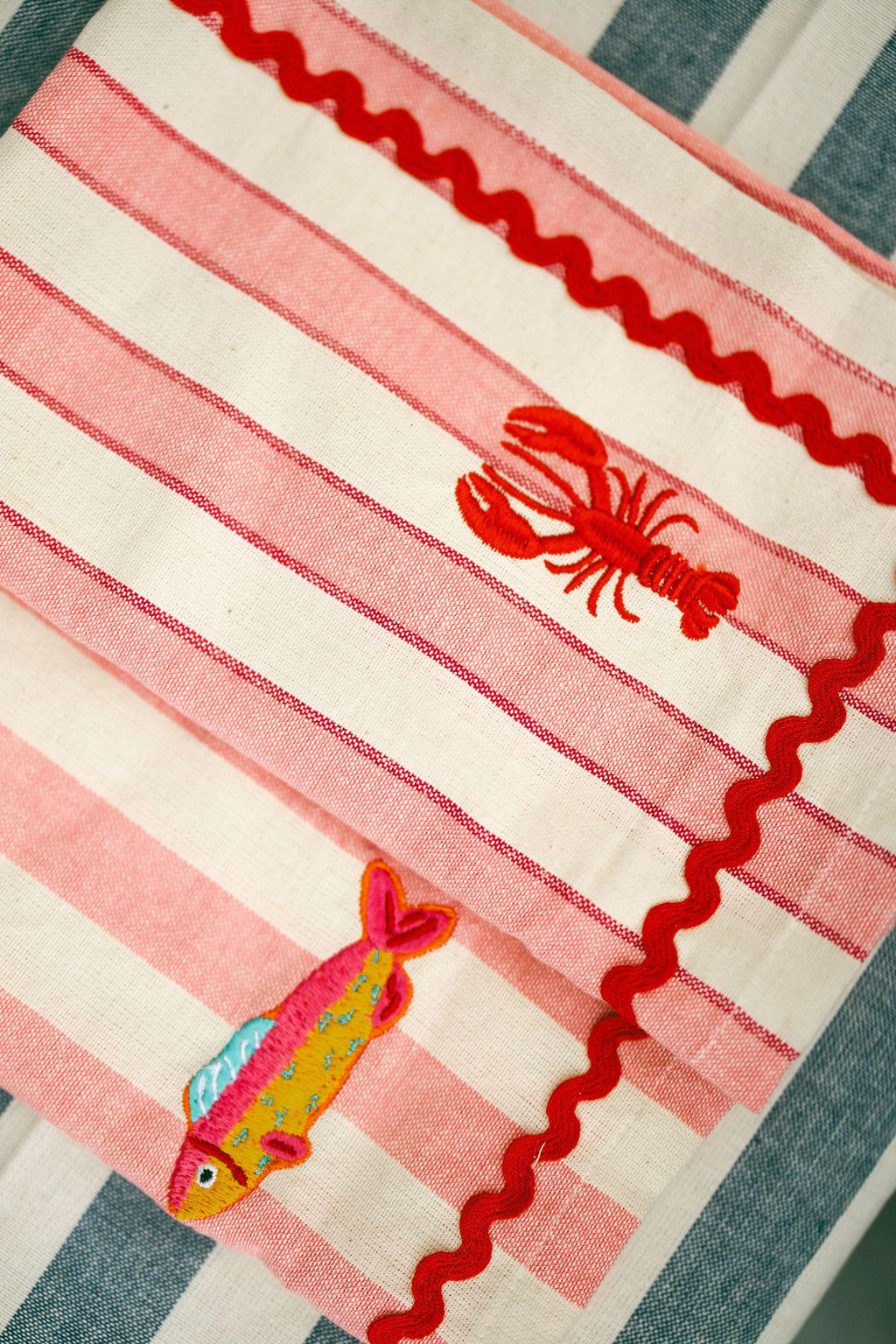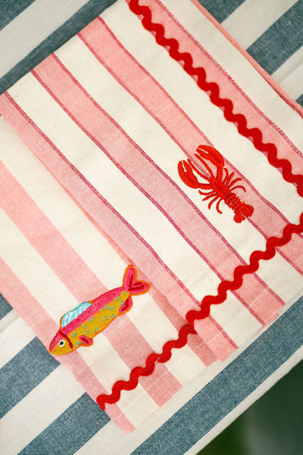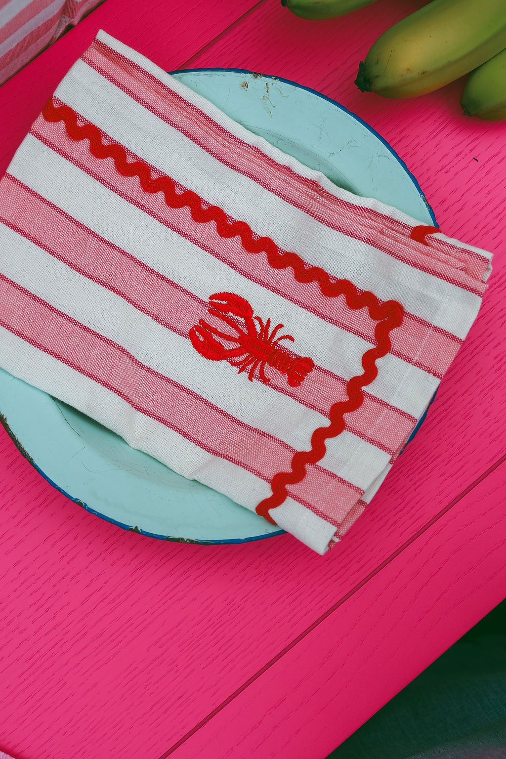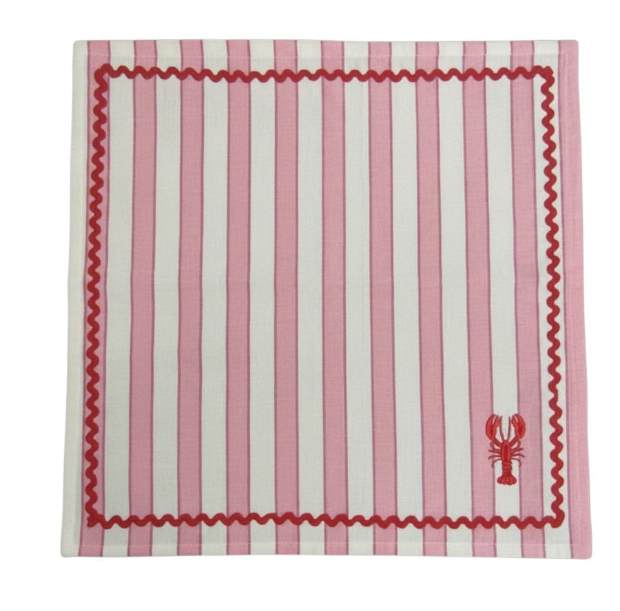 Bold, playful and made for memorable meals, the Riviera Lobster Napkin Set brings effortless coastal charm to the table. Crafted from soft cotton with classic pink stripes, each napkin is finished with contrast red ric rac trim and a striking embroidered lobster detail for a fun yet elevated look.
