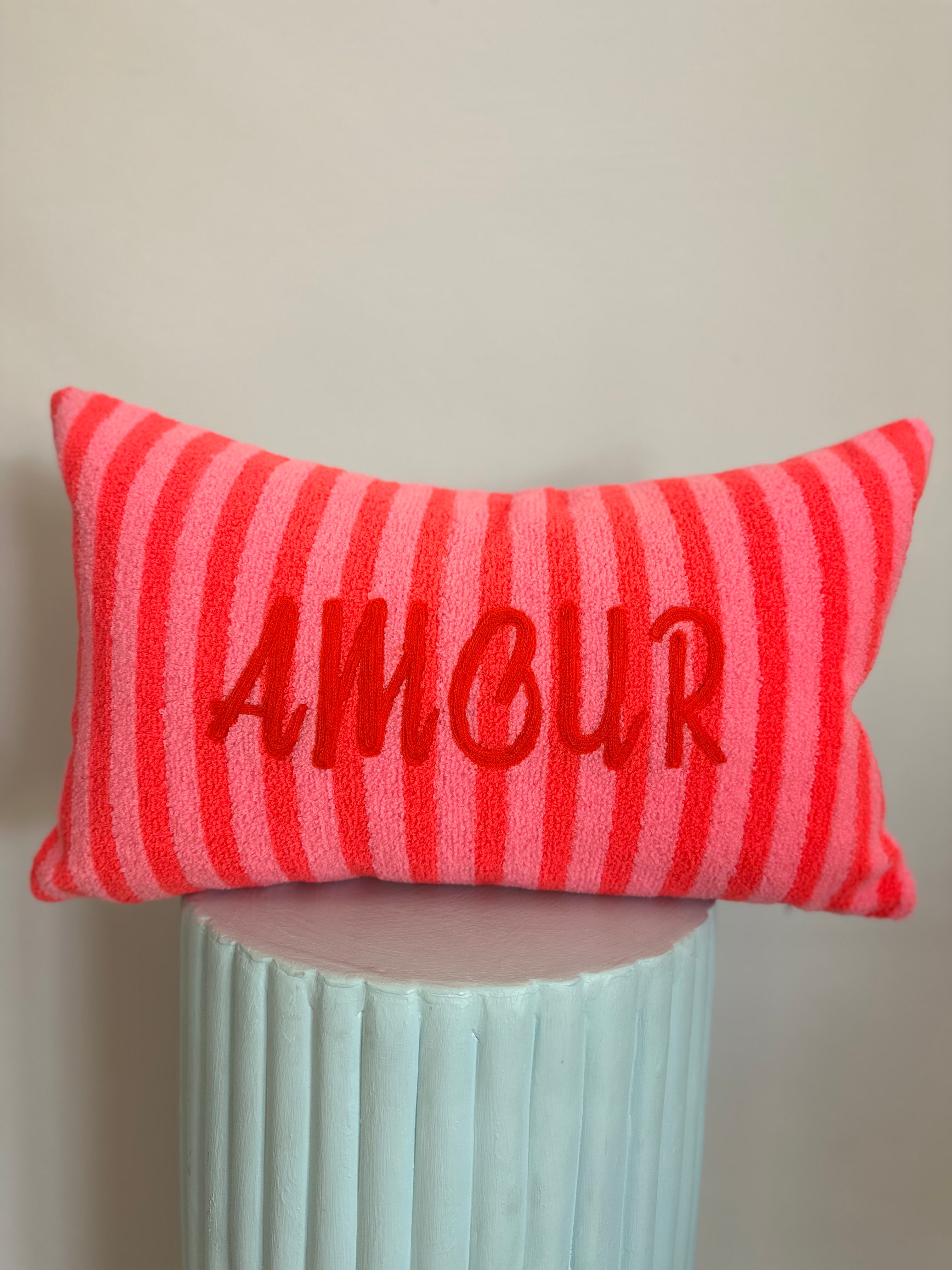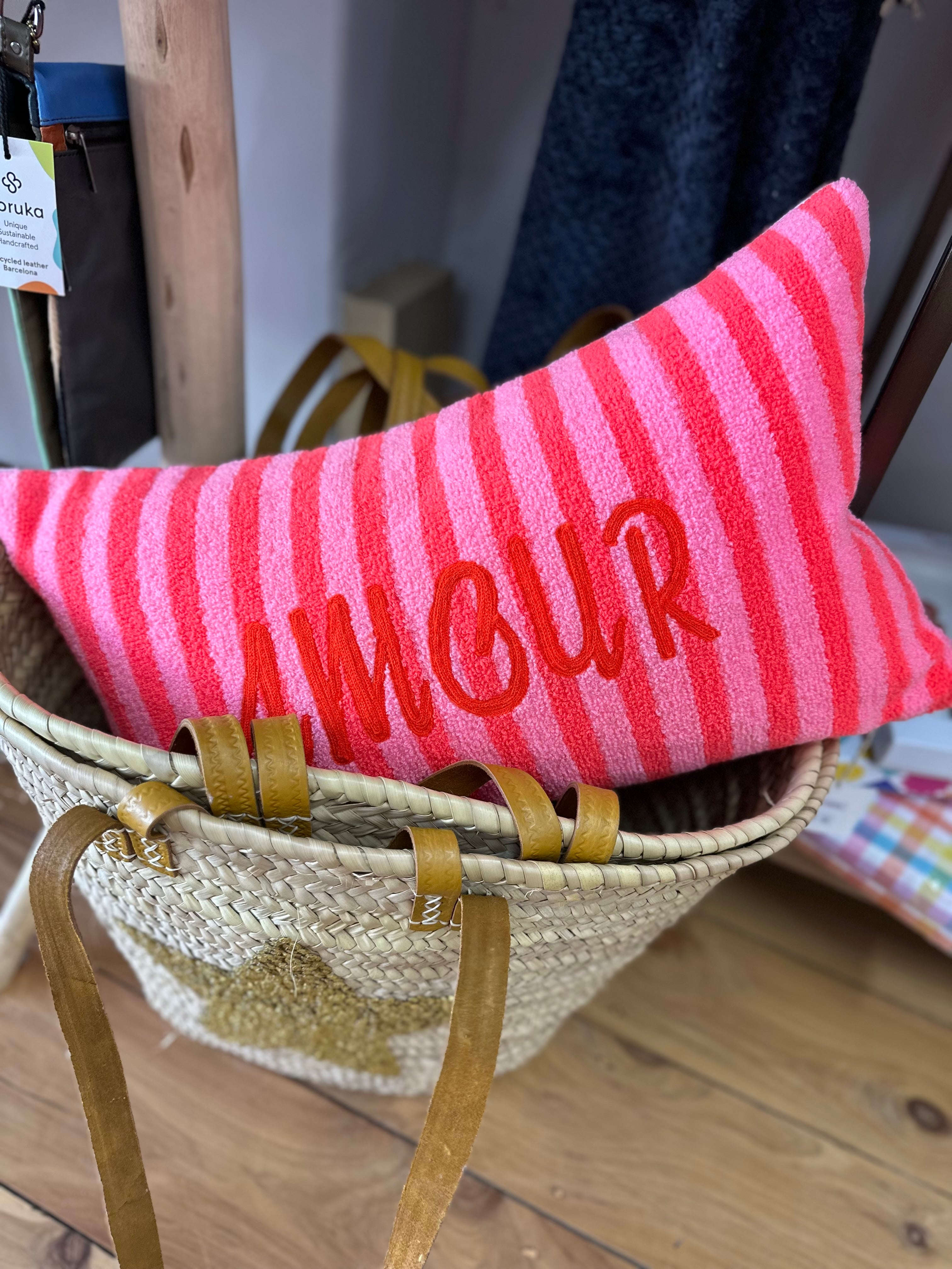 Add a pop of personality to your space with this charming cushion, featuring bold bright pink stripes paired with a delicate red "amour" embroidery. Perfect for injecting a touch of romance and whimsy into any room, this playful piece brings warmth and character to your décor. Whether styled on a bed, sofa, or reading nook, it's the ideal accent to spark joy and conversation.
