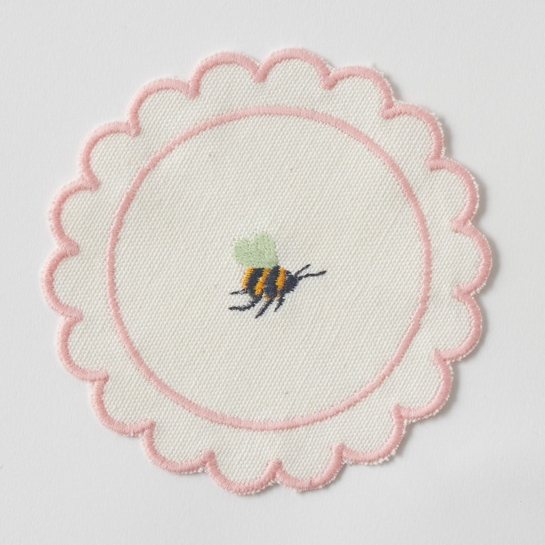 The Anjou Embroidered Cocktail Coaster brings a soft charm and elegance to dining and entertaining spaces. Made from 100% cotton and designed in-house in Melbourne, this round coaster features a scalloped edge and tonal embroidery in soft greens and blush tones; perfect for complementing seasonal drinks and table styling.
