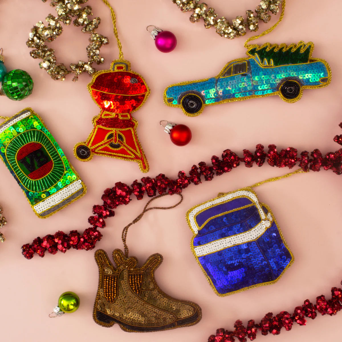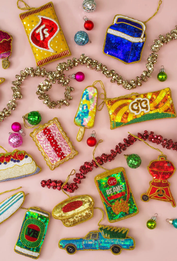 Deck your halls with a cheeky slice of Aussie magic! This exclusive collaboration with designer Phoebe Gazal from Papier D'Amour, brings beloved local icons to life as shimmering beaded sequin ornaments. Choose from red frogs, sausage sizzles, Milo tins, hundreds and thousands, gold beer, violet rumbles, and cherry bites—each one a nostalgic nod to iconic Aussie treats. Bursting with colour and personality, these ornaments are the perfect way to add fun to your tree, brighten your table, or surprise someone special. A uniquely Australian Christmas treasure. Pair with our other ranges of iconic Australiana ornaments to have a unique, fun and sparkly Christmas!