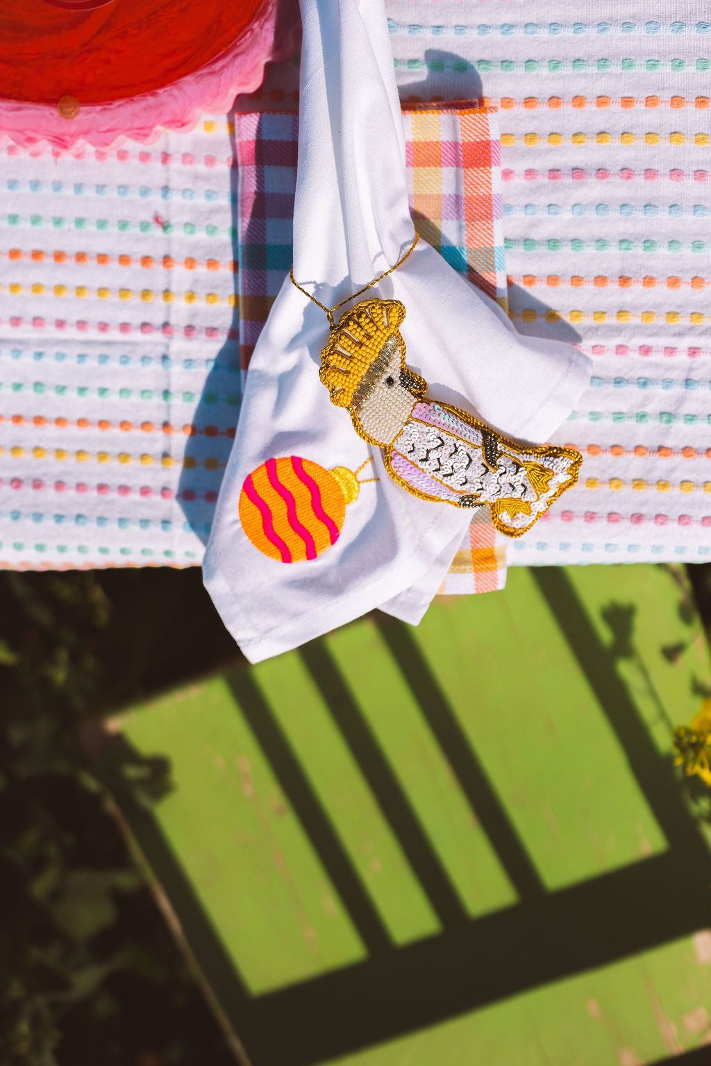 This playful set of four cotton napkins, each measuring 45x45cm, features charming embroidered designs perfect for the festive season. Enjoy a bauble, a bell, a gingerbread, a tree, and a star (all designs approx 8cm tall) that add a fun and detailed touch to your holiday table. Brighten your celebrations with these delightful embroidered patterns!