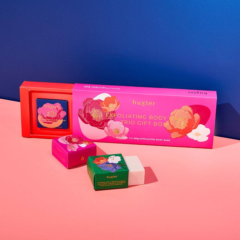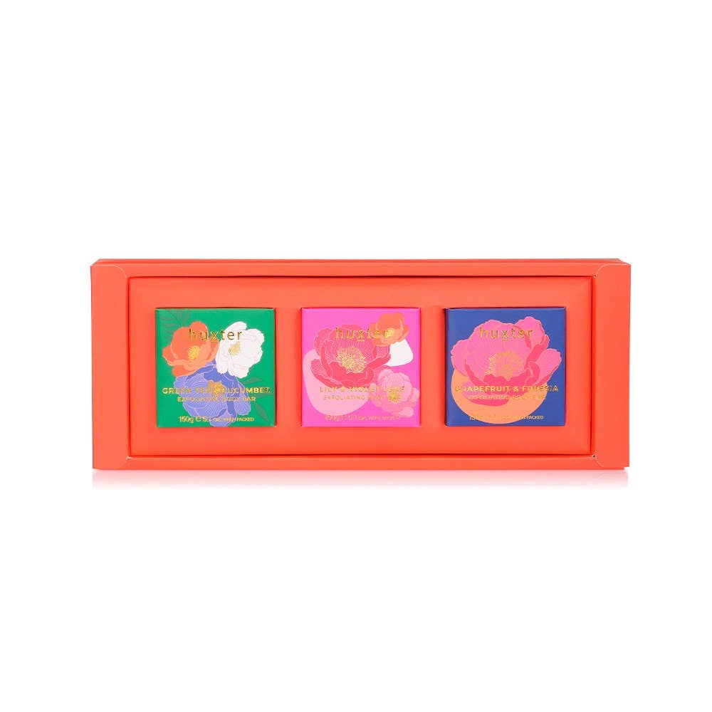 Indulge in the luxurious NEW Huxter Exfoliating Body Bar Trio - three beautifully packaged triple milled 150g bars. Enriched with organic shea butter, vitamin e, and jojoba seed, these bars offer a creamy lather and gentle exfoliation. Experience the delightful scents of Grapefruit & Freesia, Lily & Violet Leaf, and Green Tea & Cucumber. Elevate your shower routine with this must-have set!