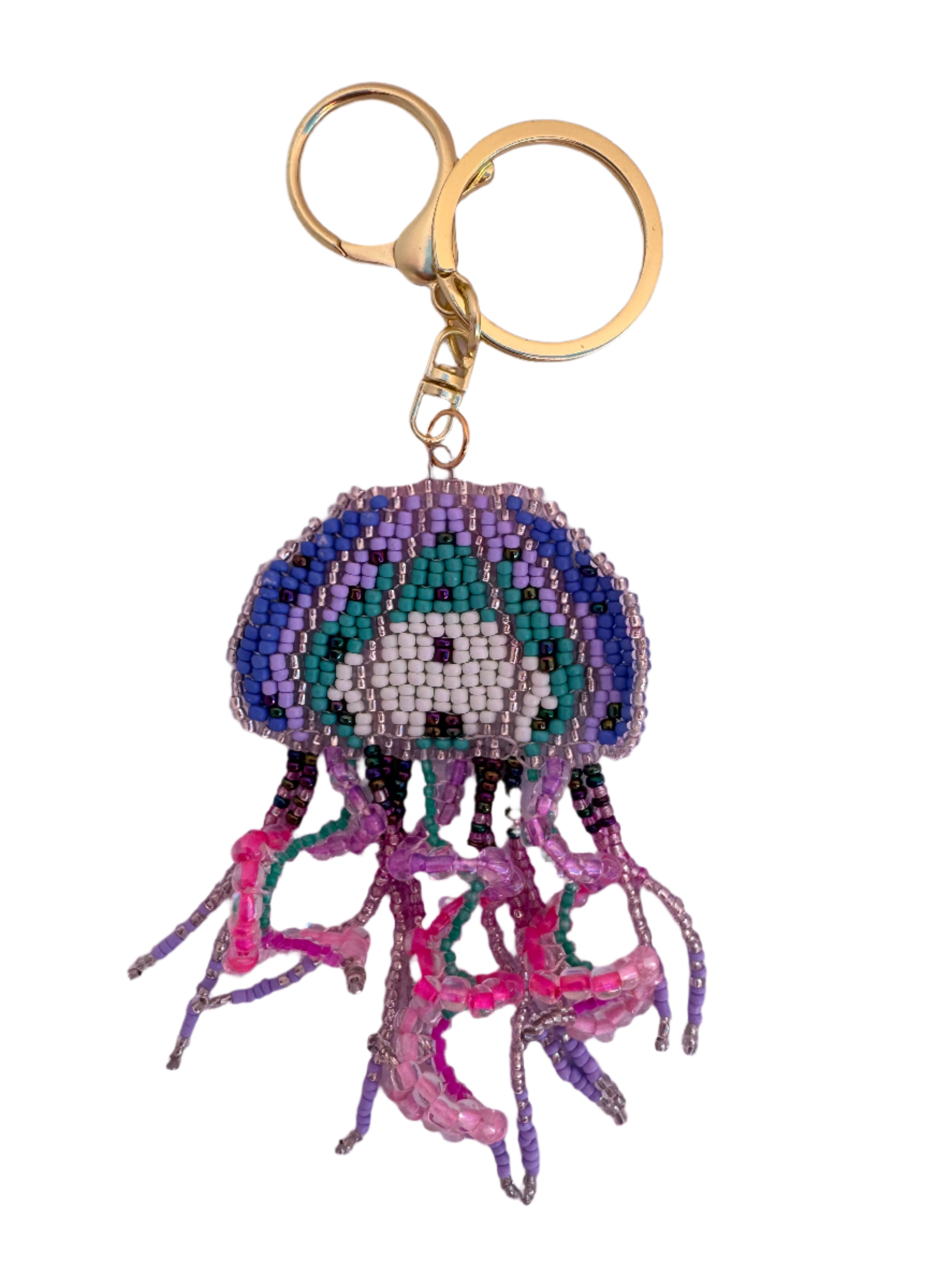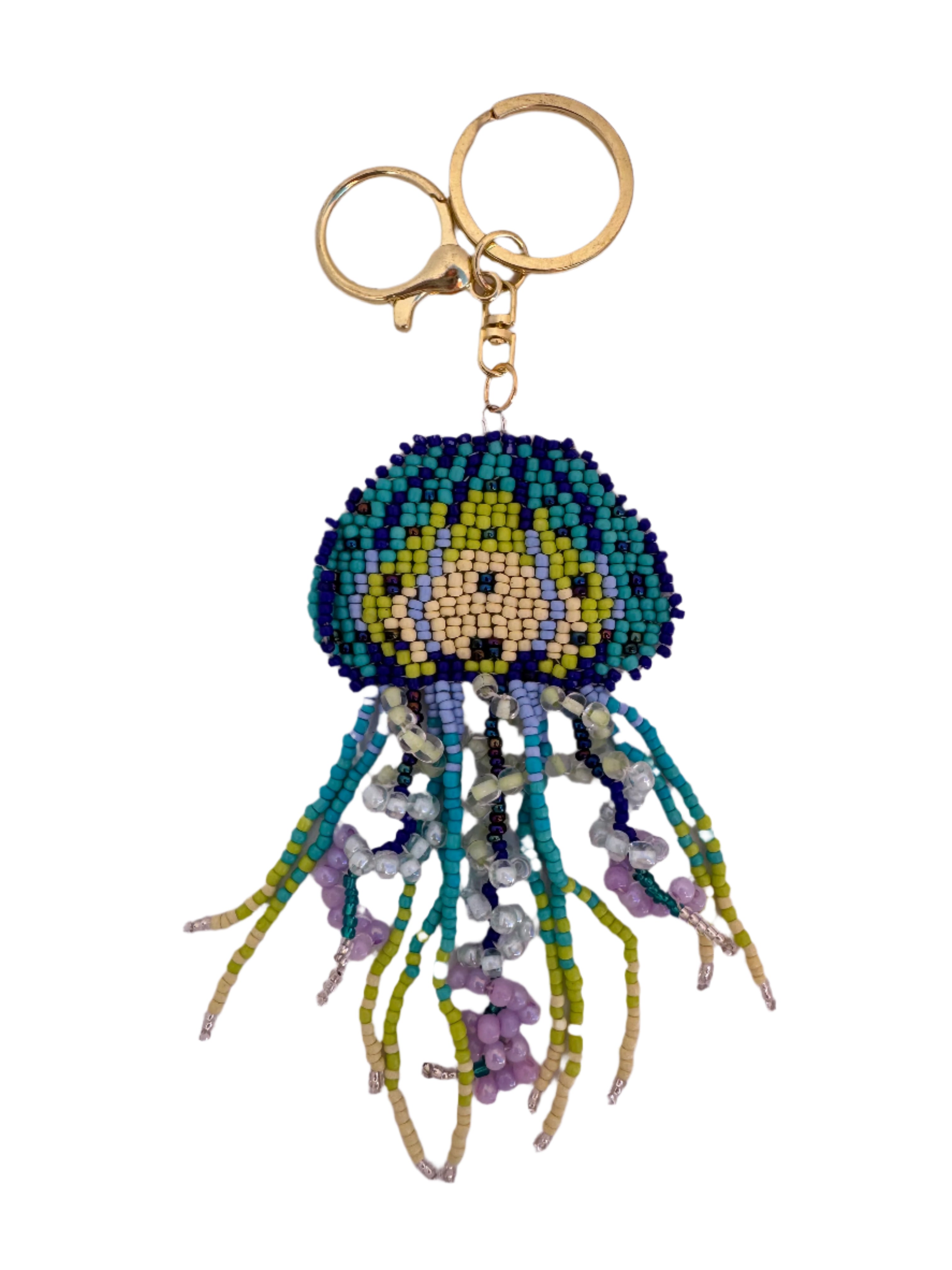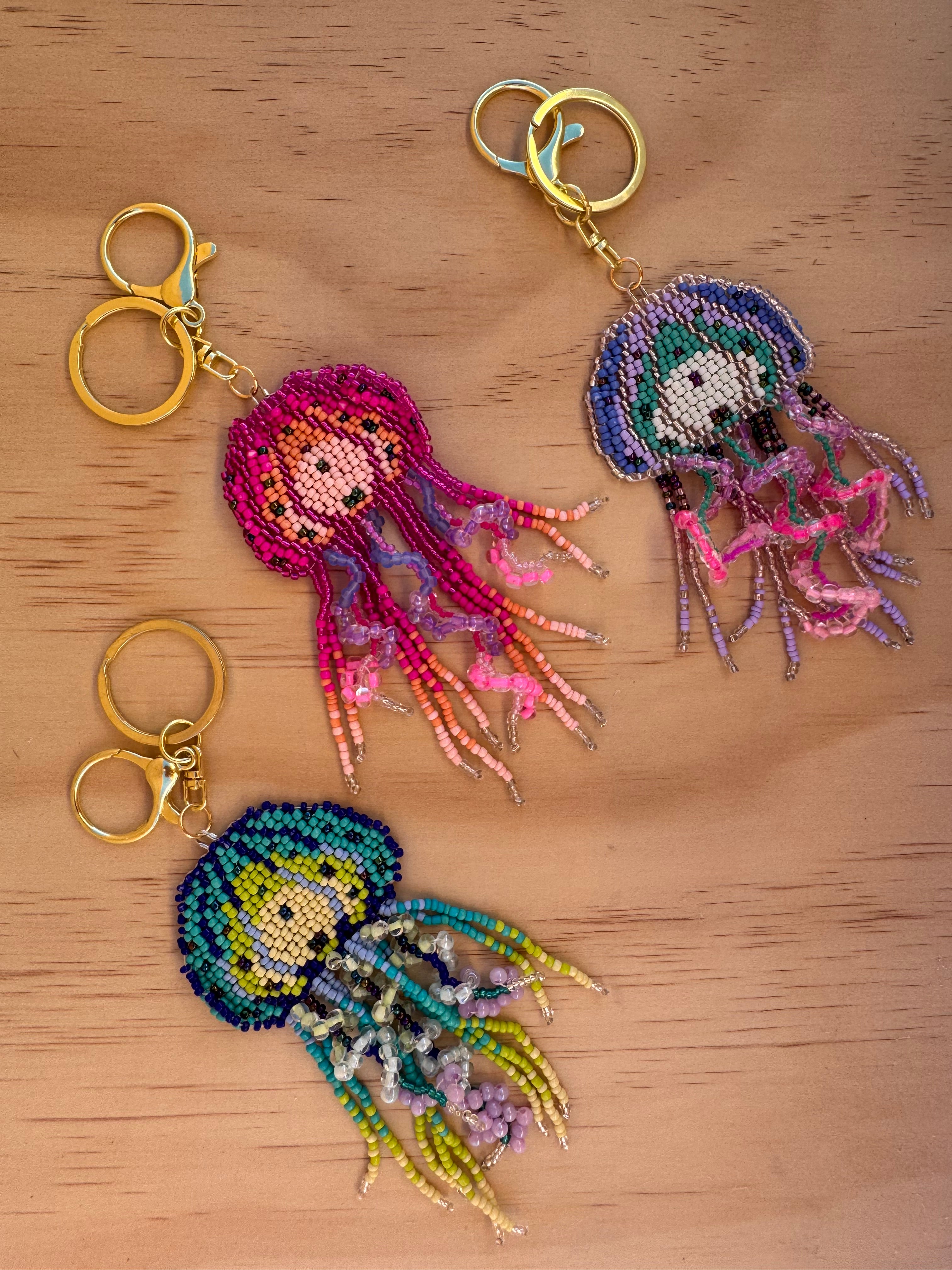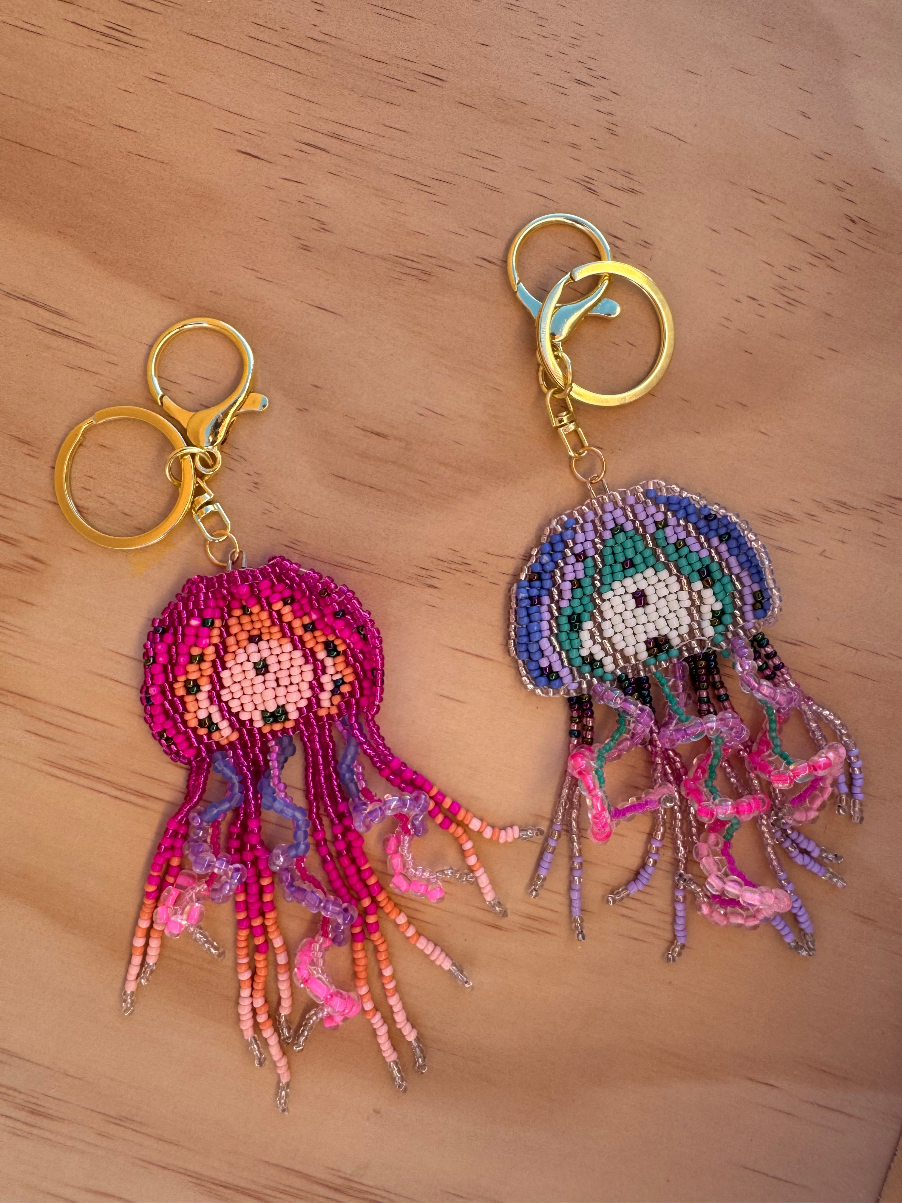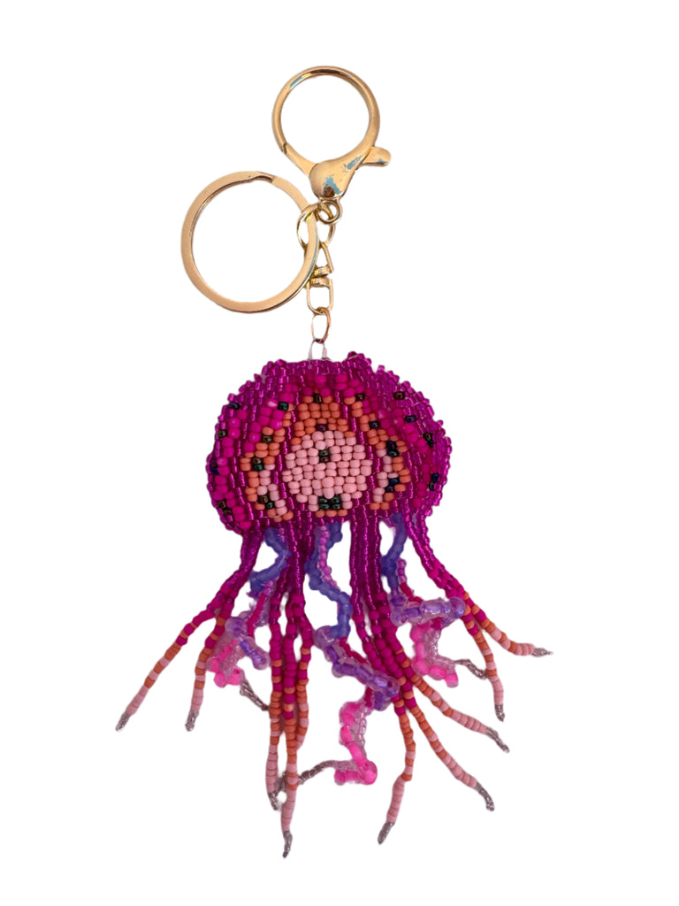 Add a splash of whimsy to your keys with this super fun Jellyfish Beaded Keyring! Measuring 12cm long, it features curled tentacles crafted with intricate beading in three vibrant colourways. The gold ring and clasp make it easy to attach while adding a touch of shine. Perfect for anyone who loves playful, detailed accessories that stand out.