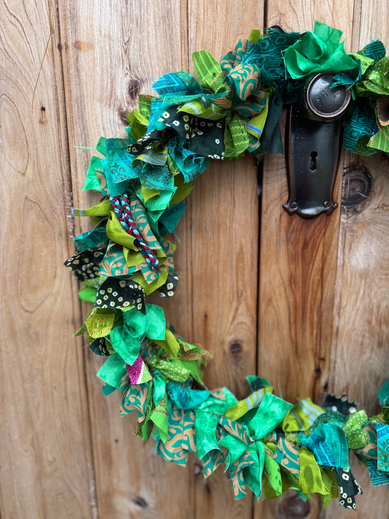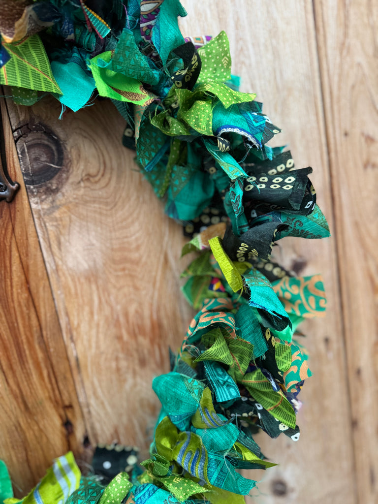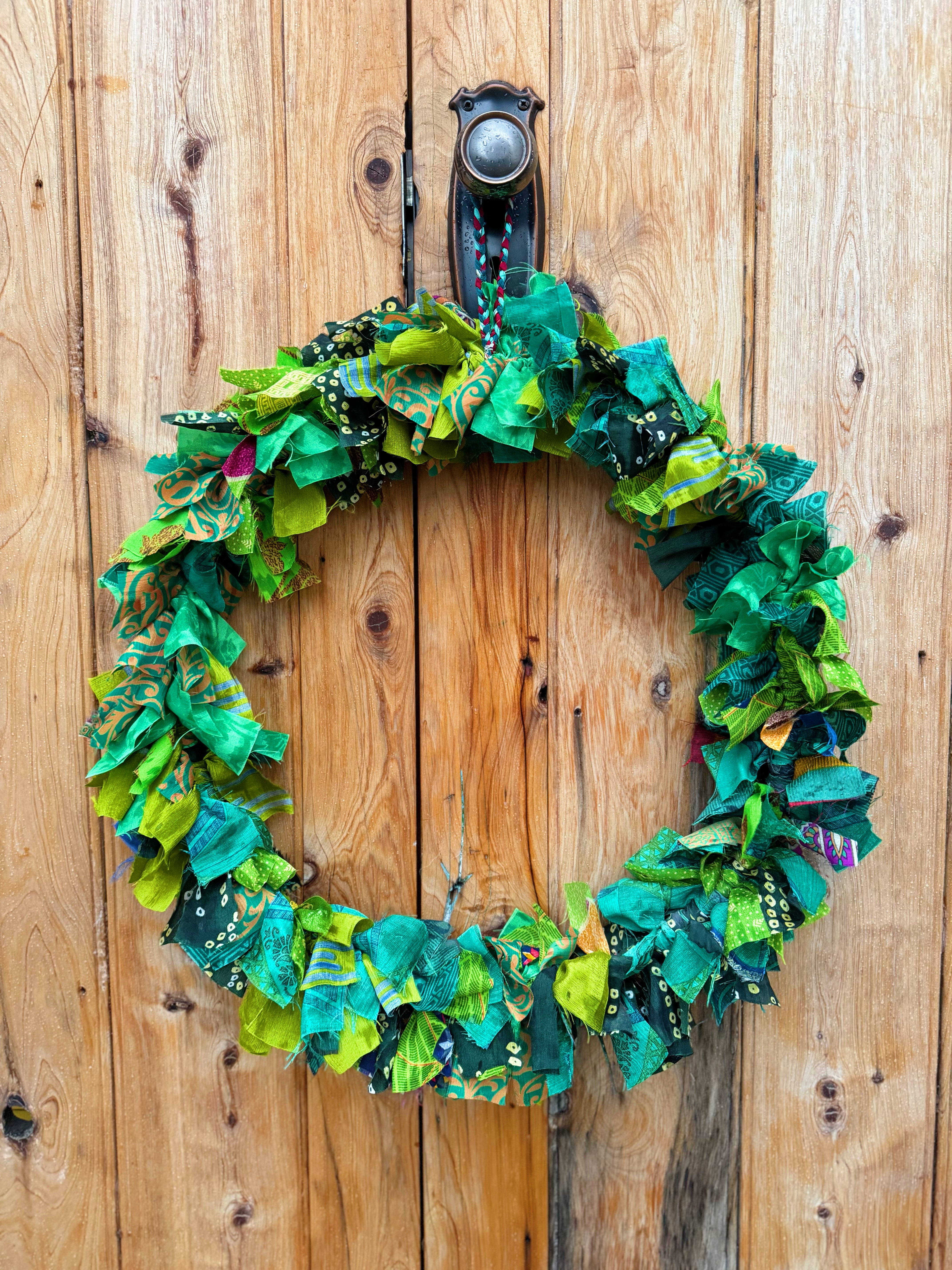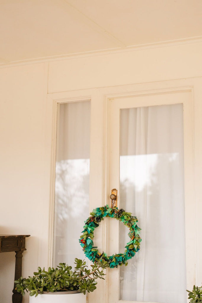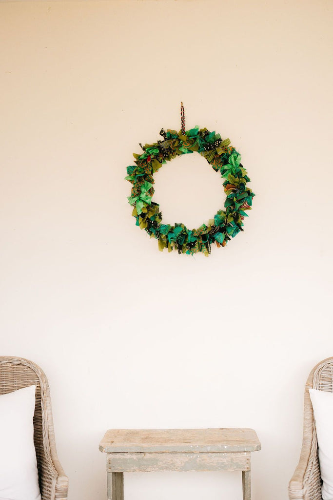 Celebrate the festive season with this playful Christmas wreath made from recycled fabrics in cheerful shades and patterns. With a 42cm round frame and 55cm including fabric, it’s the perfect eco-friendly decoration to brighten your door or wall. Featuring a handy hanging loop, this vibrant green wreath adds a joyful, sustainable touch to your holiday decor.